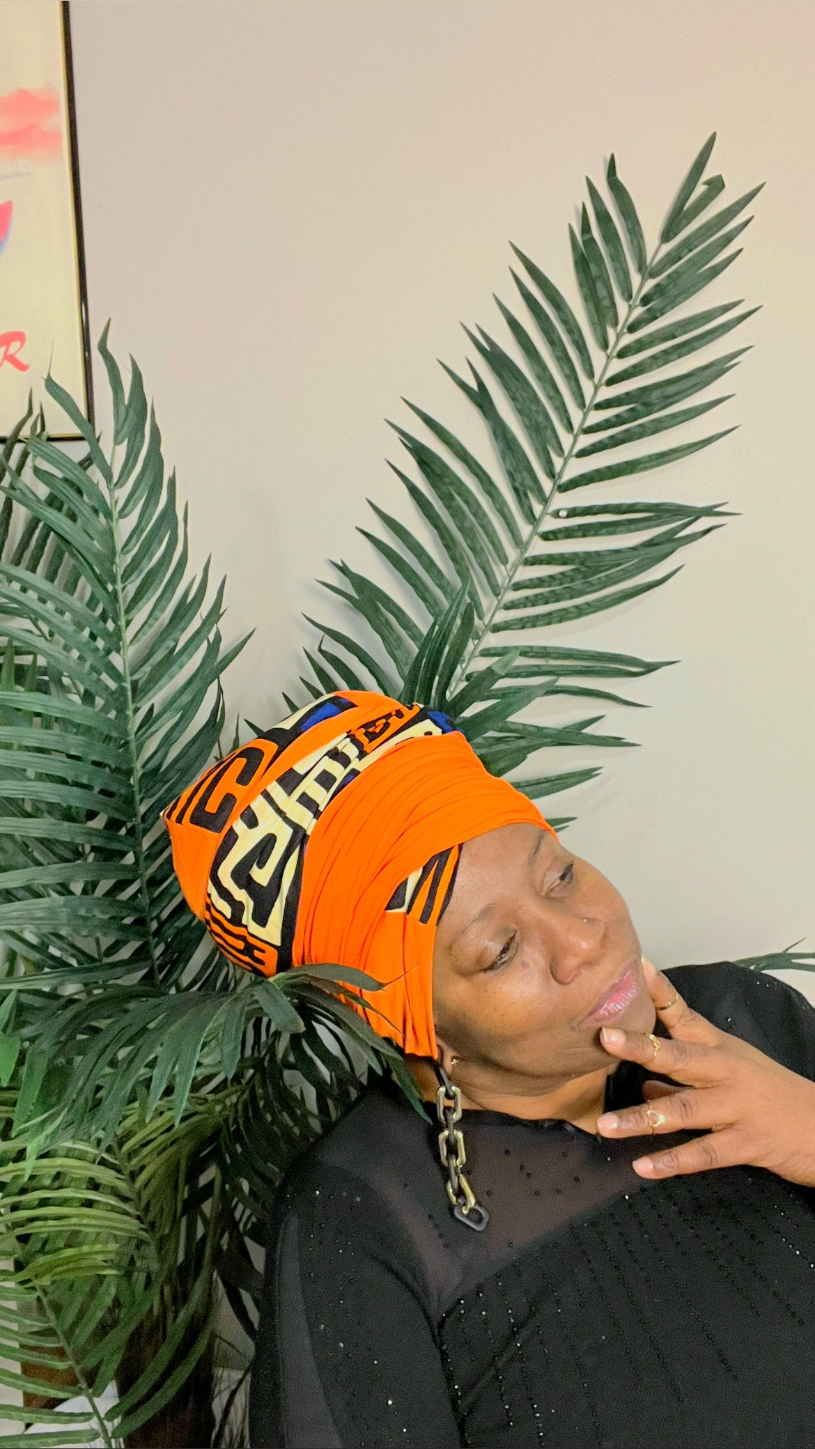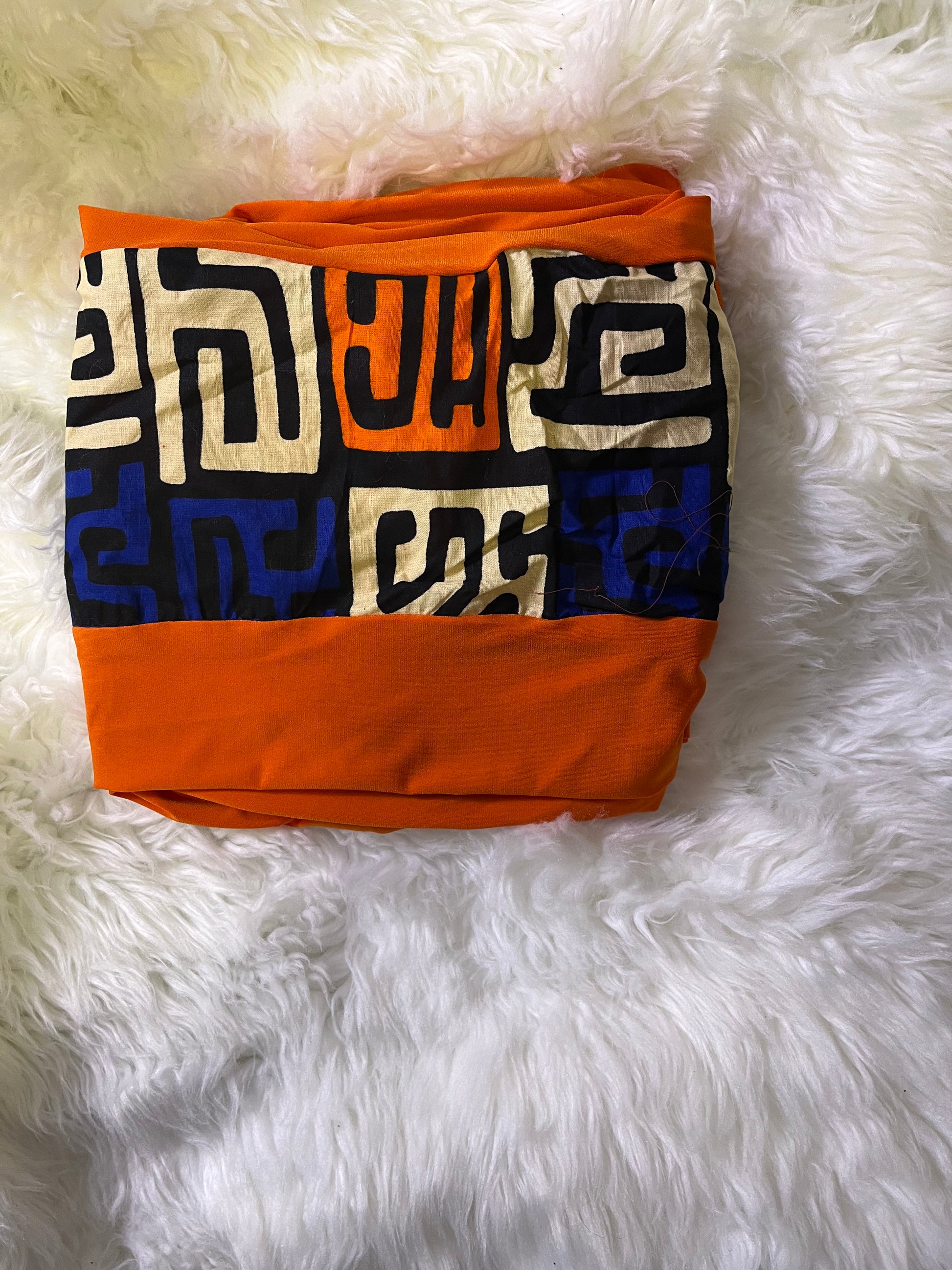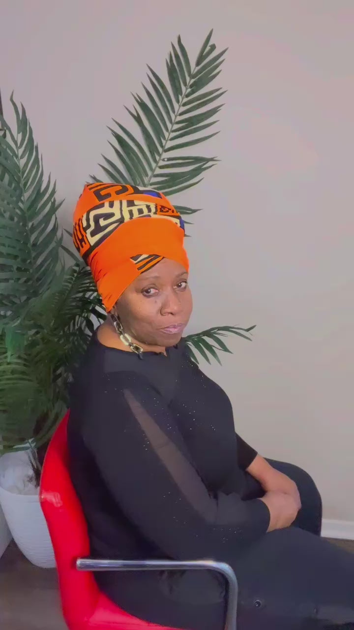 The wrap is made from quality orange lightweight stretchy knit fabric that wont shrink or pill. Trimmed with an Afrocentric print.