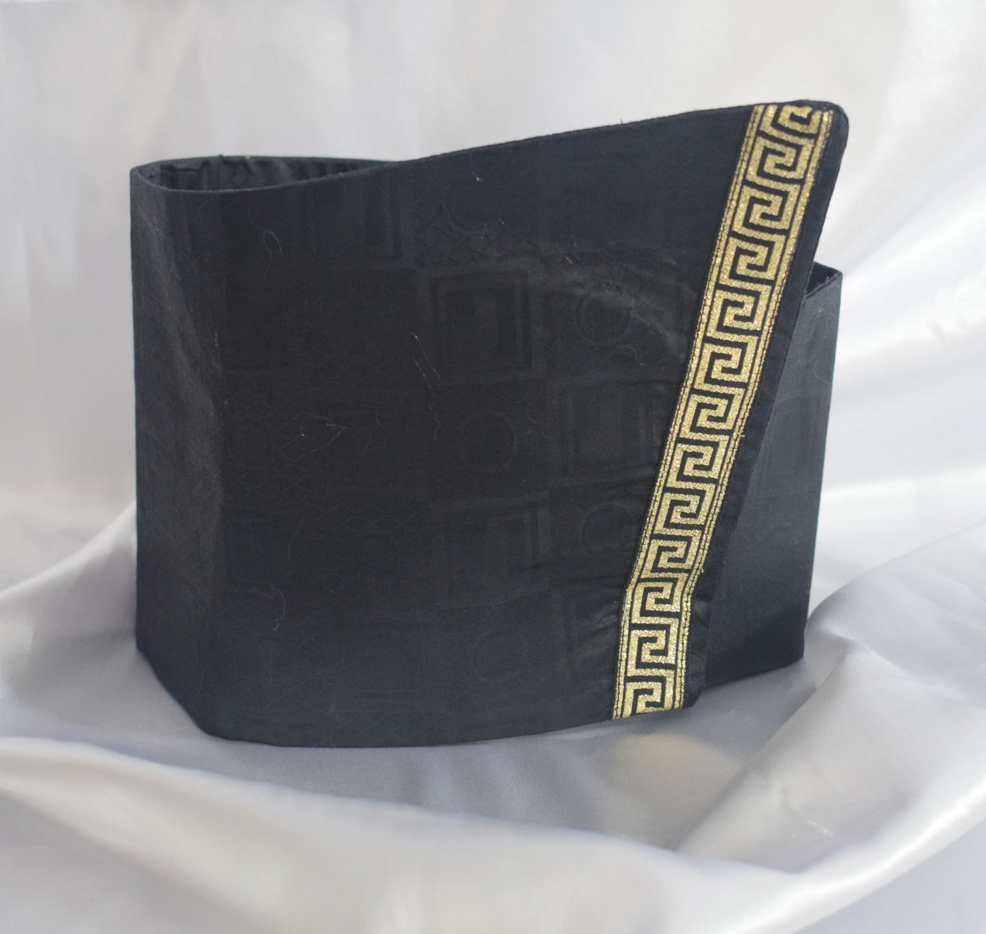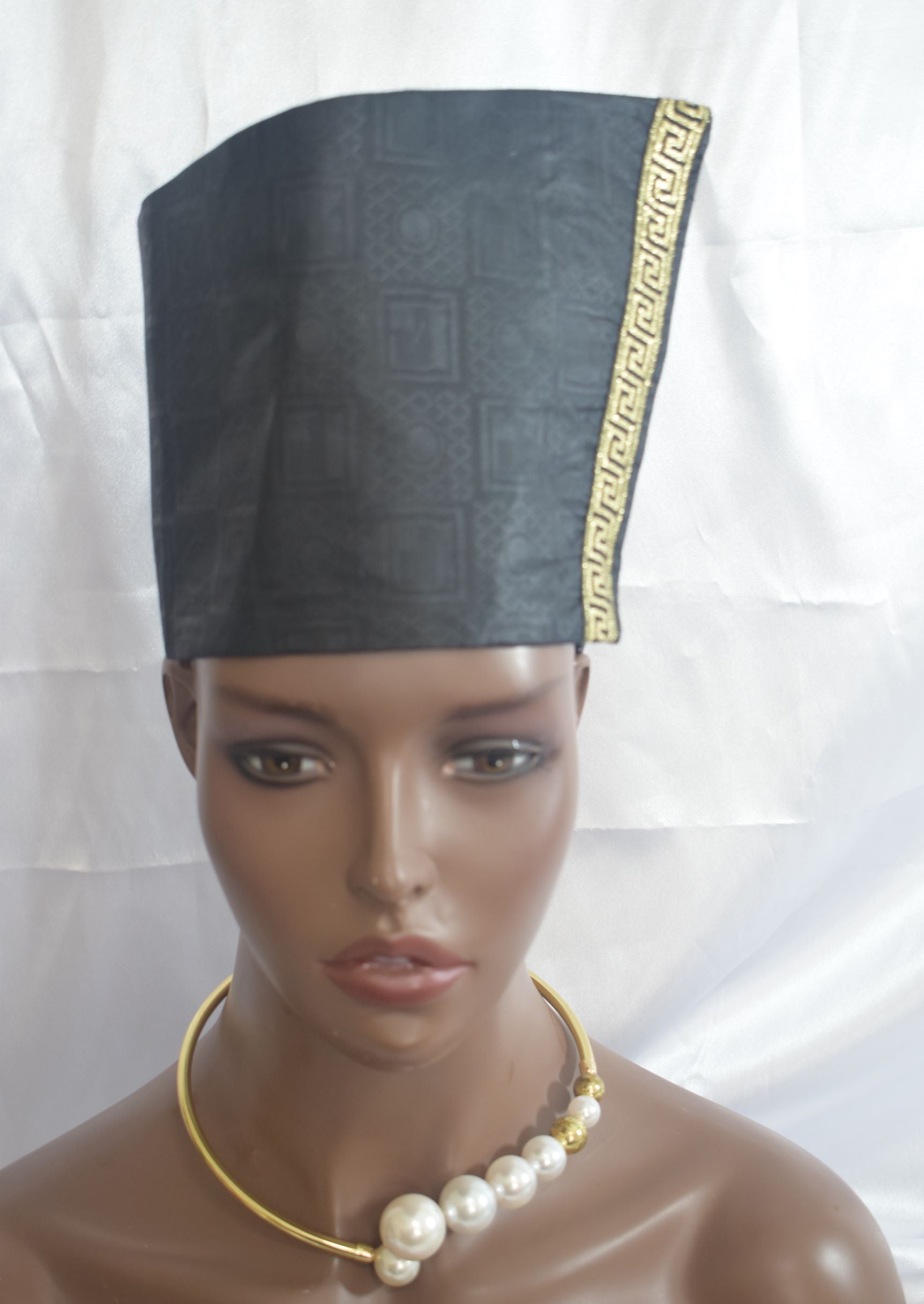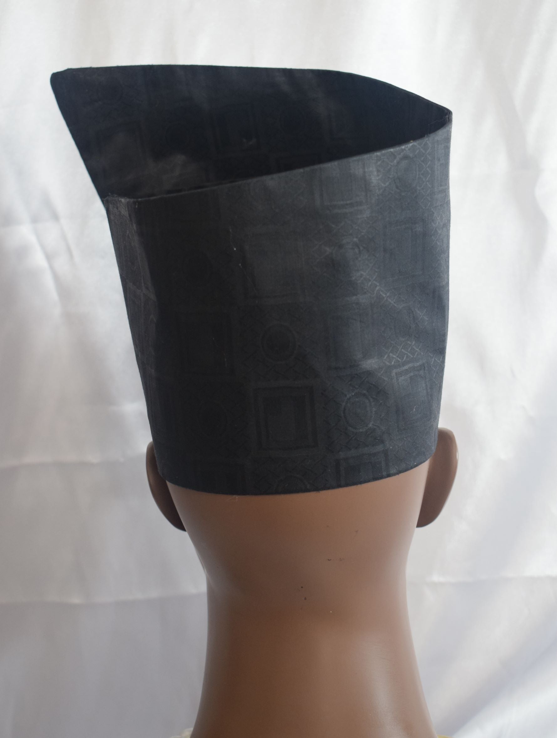 This brocade hat has no crown. A beautiful self pattern African brocade fabric, trimmed with black and gold tribal trim.