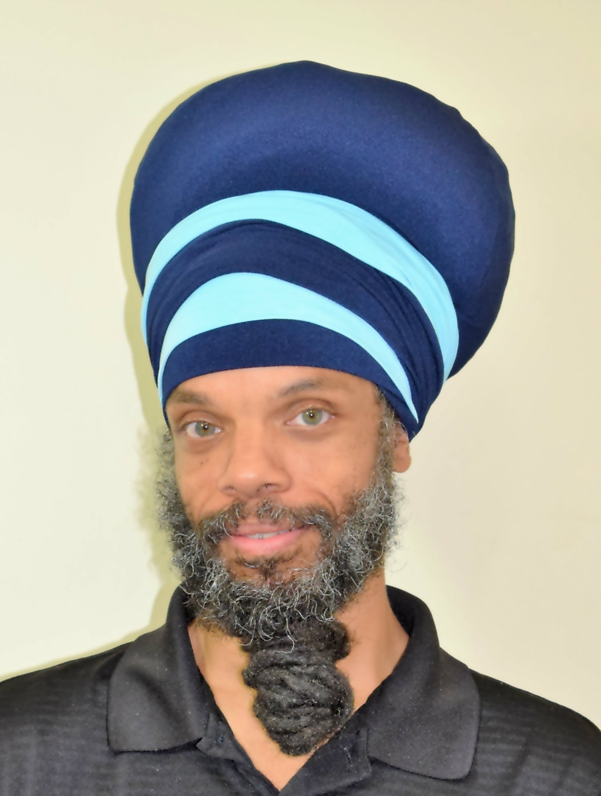 Turban is a combination of navy and light blue.
