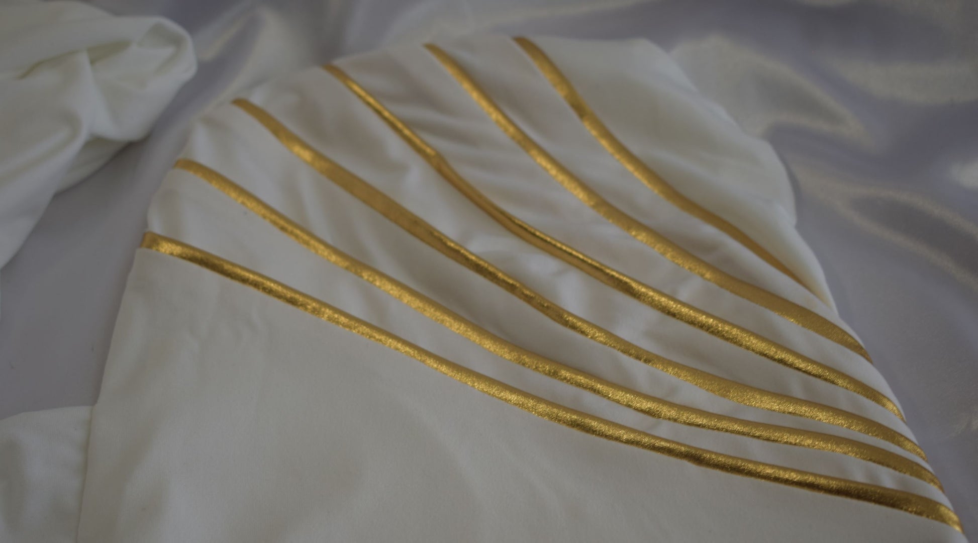 This EZ Wrap is detailed, done in quality stretch fabric and piped in gold foil lame fabric.. Great for special events.