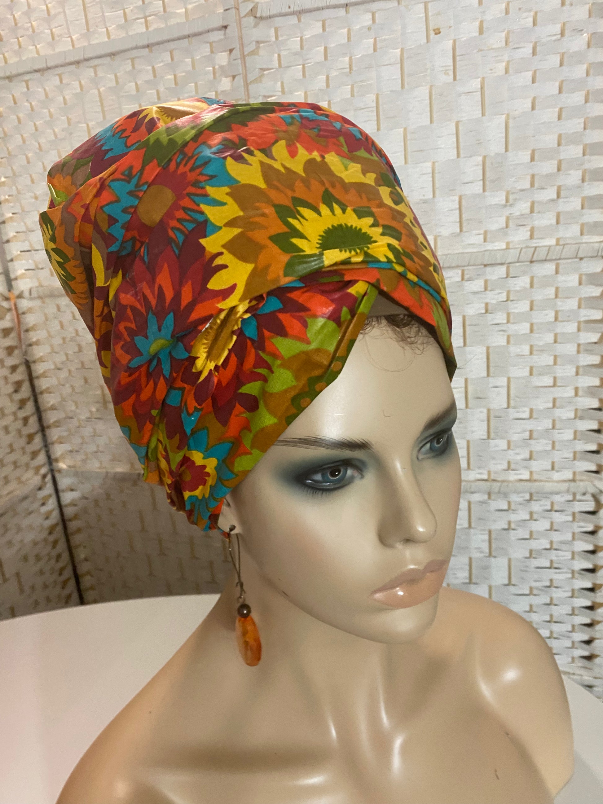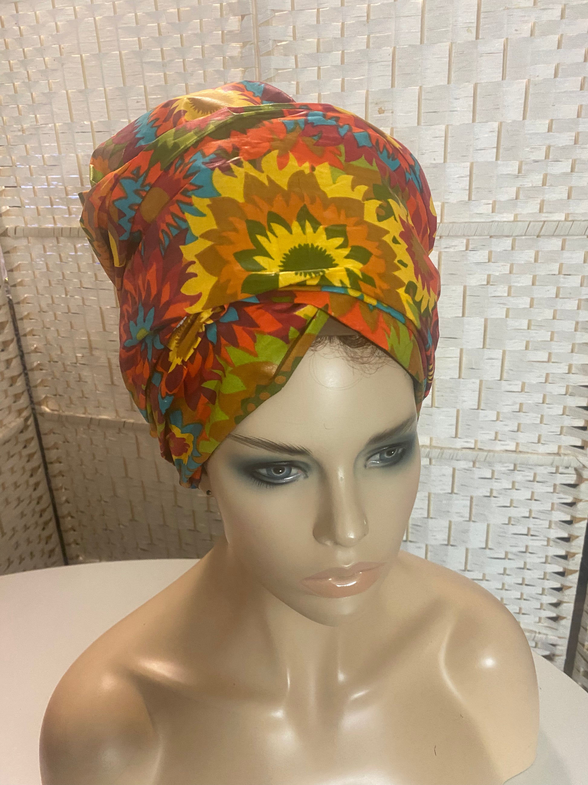 In order to preserve moisture in your hair, wrap with a silk or satin hair scarf before putting on the cotton wrap. Wrap in your desired style.