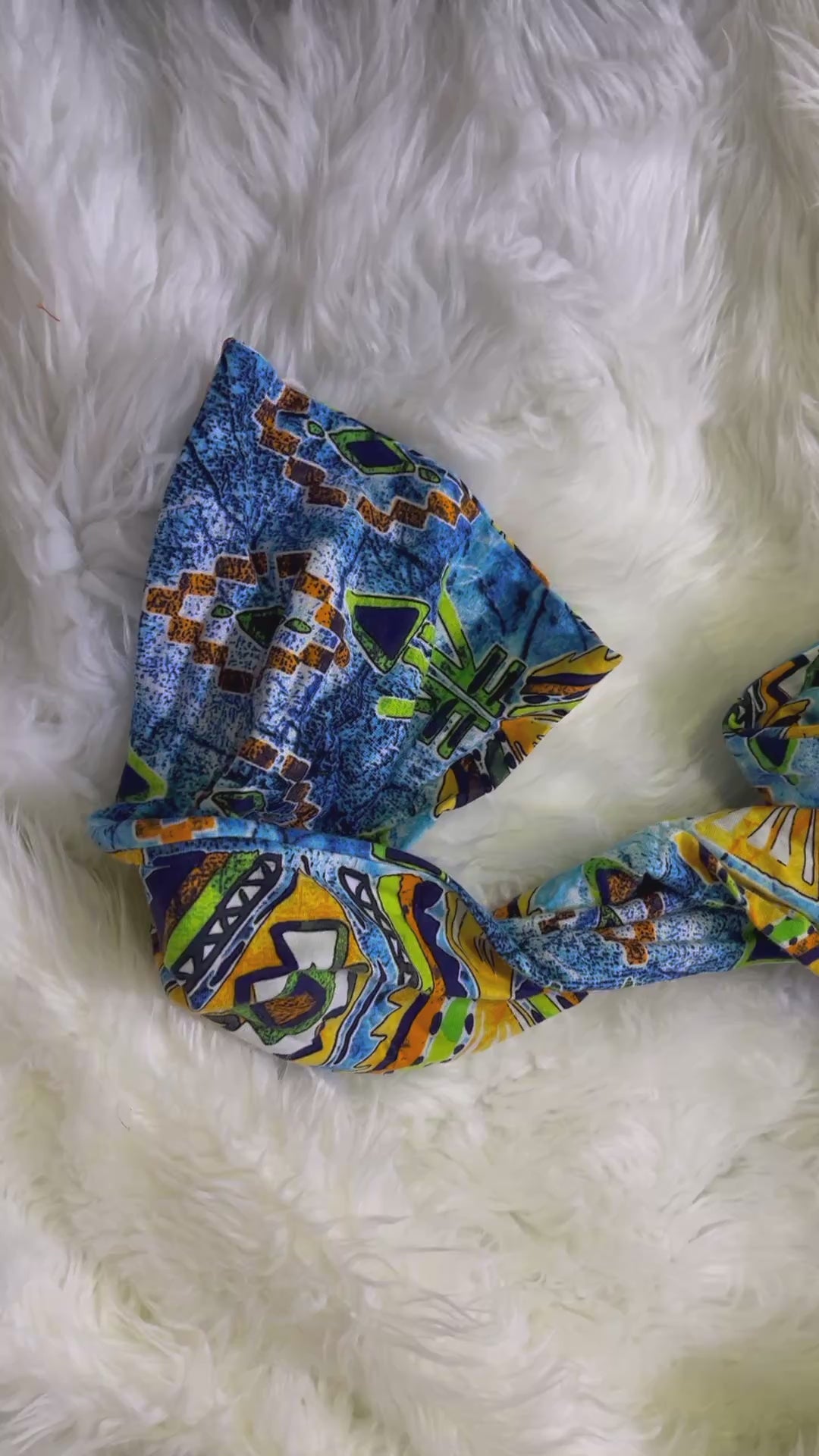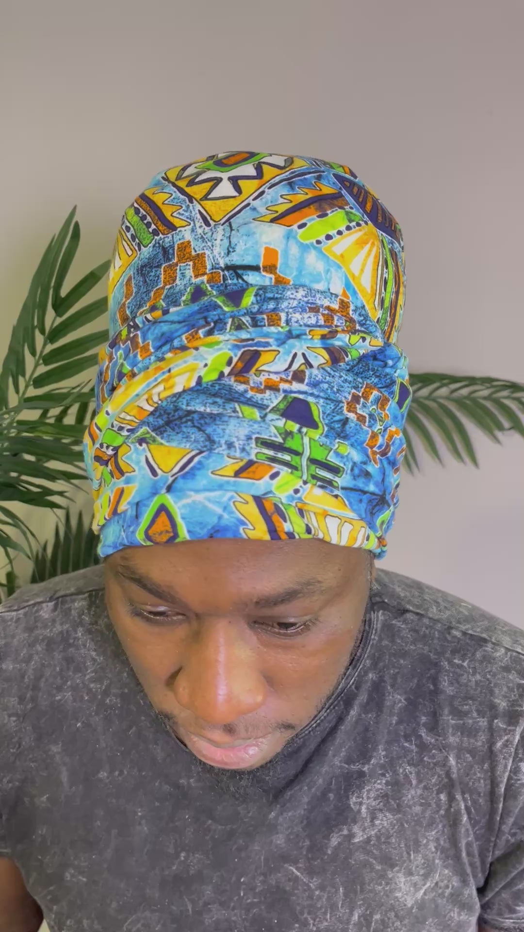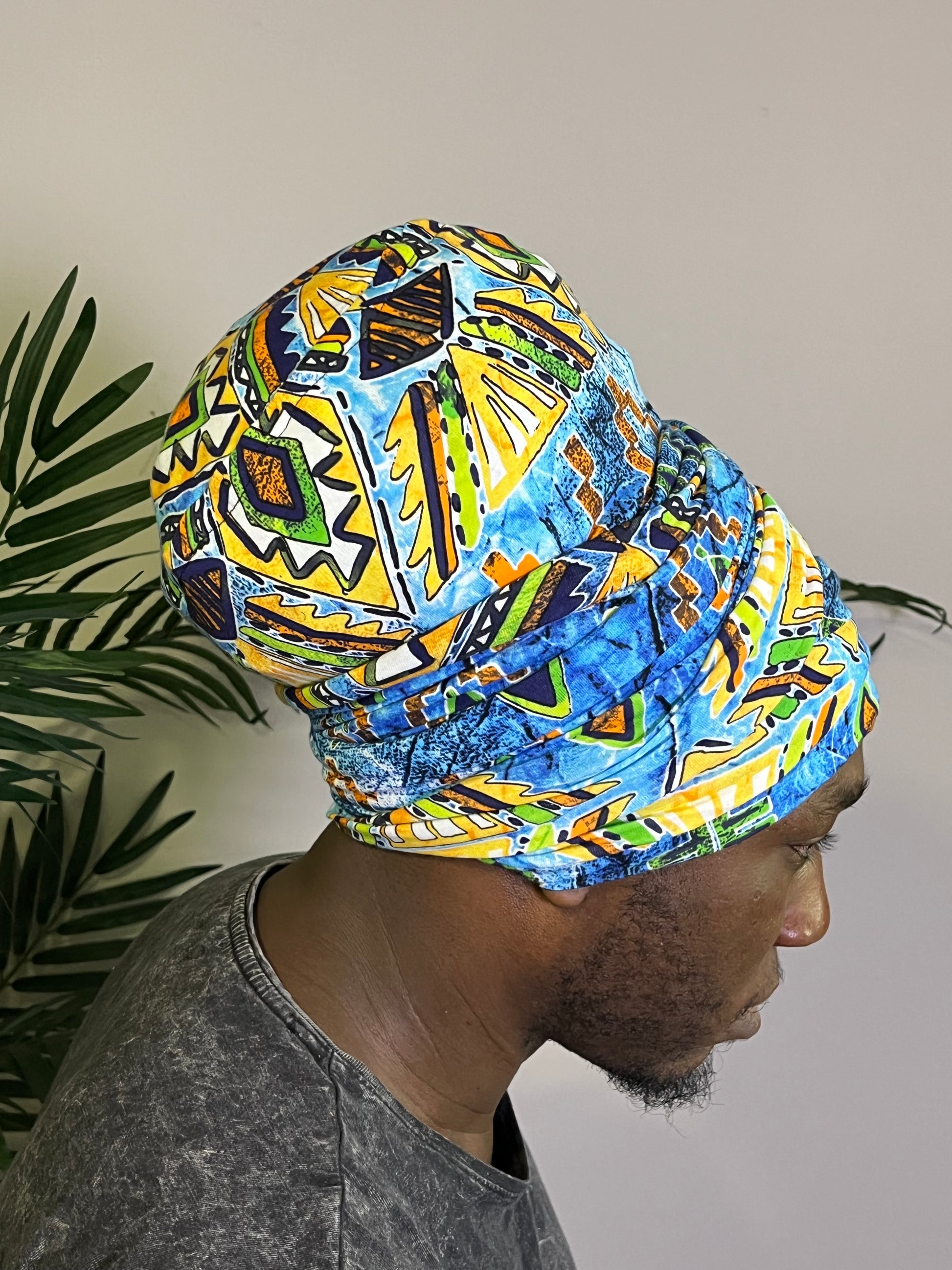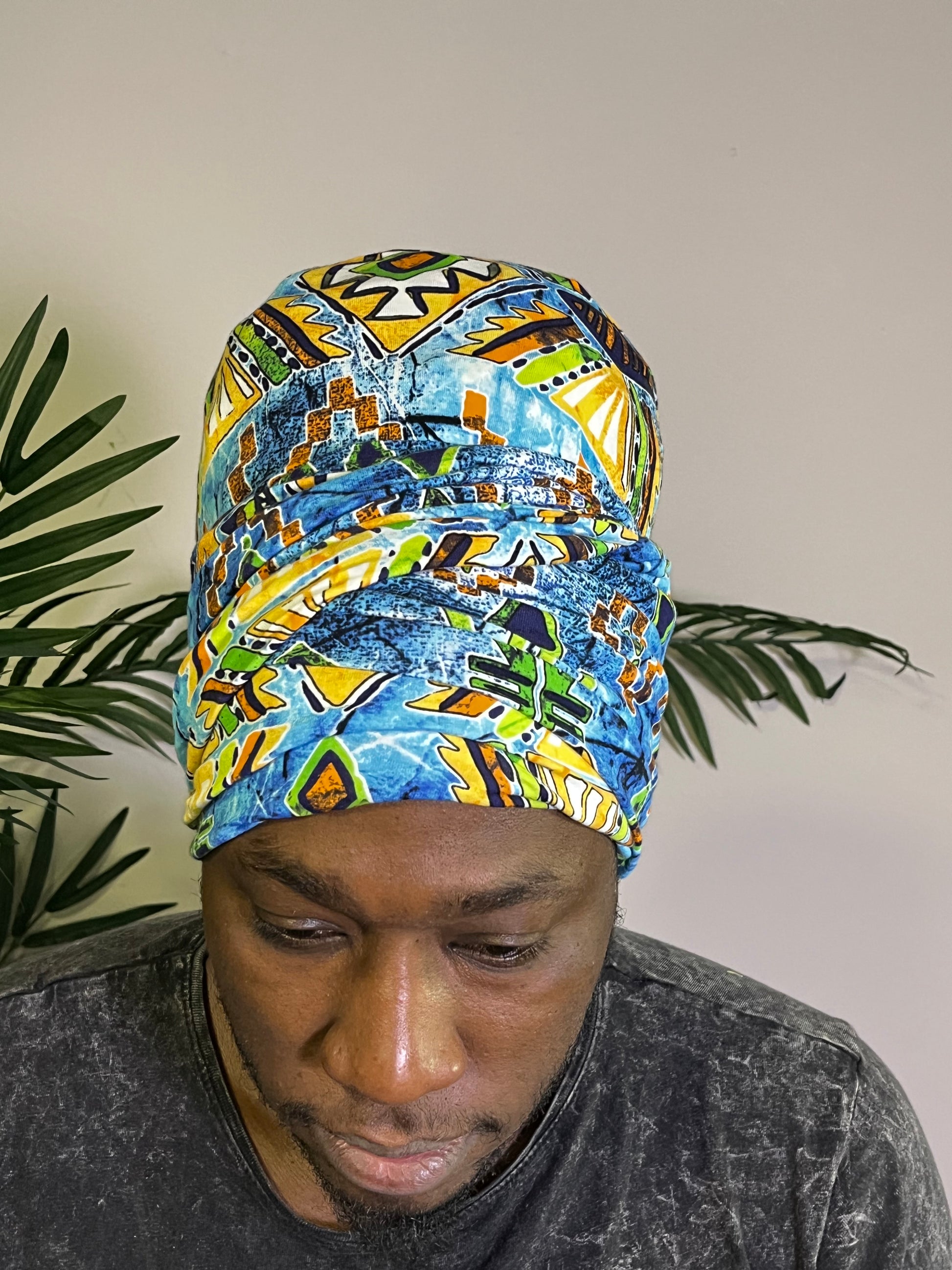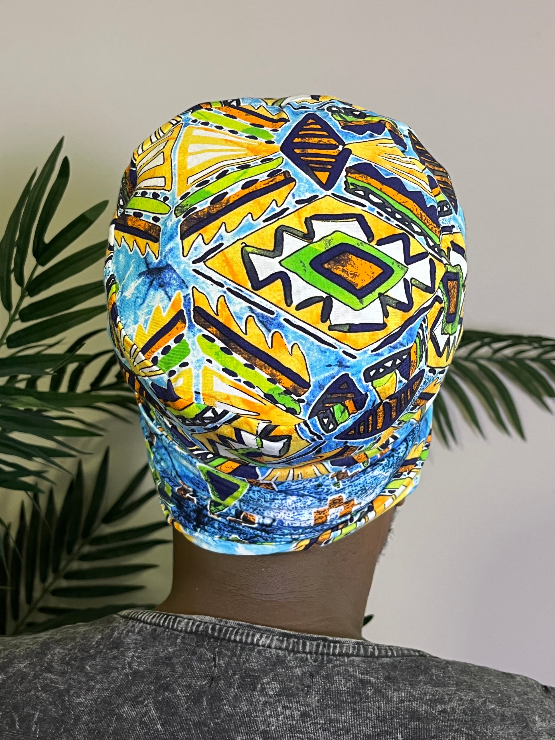 The tam wrap has a flat crown and one band at the back, colors in print are blues, orange, green, navy, white.