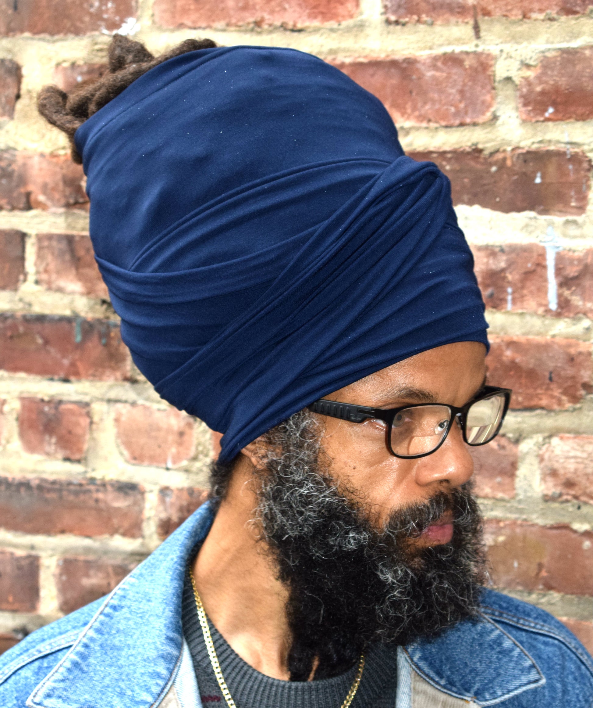 To wear tall as shown, first put your locs or hair up and slip the tube over your head, with the seam facing to the center back of your head, and adjust the height to suit.