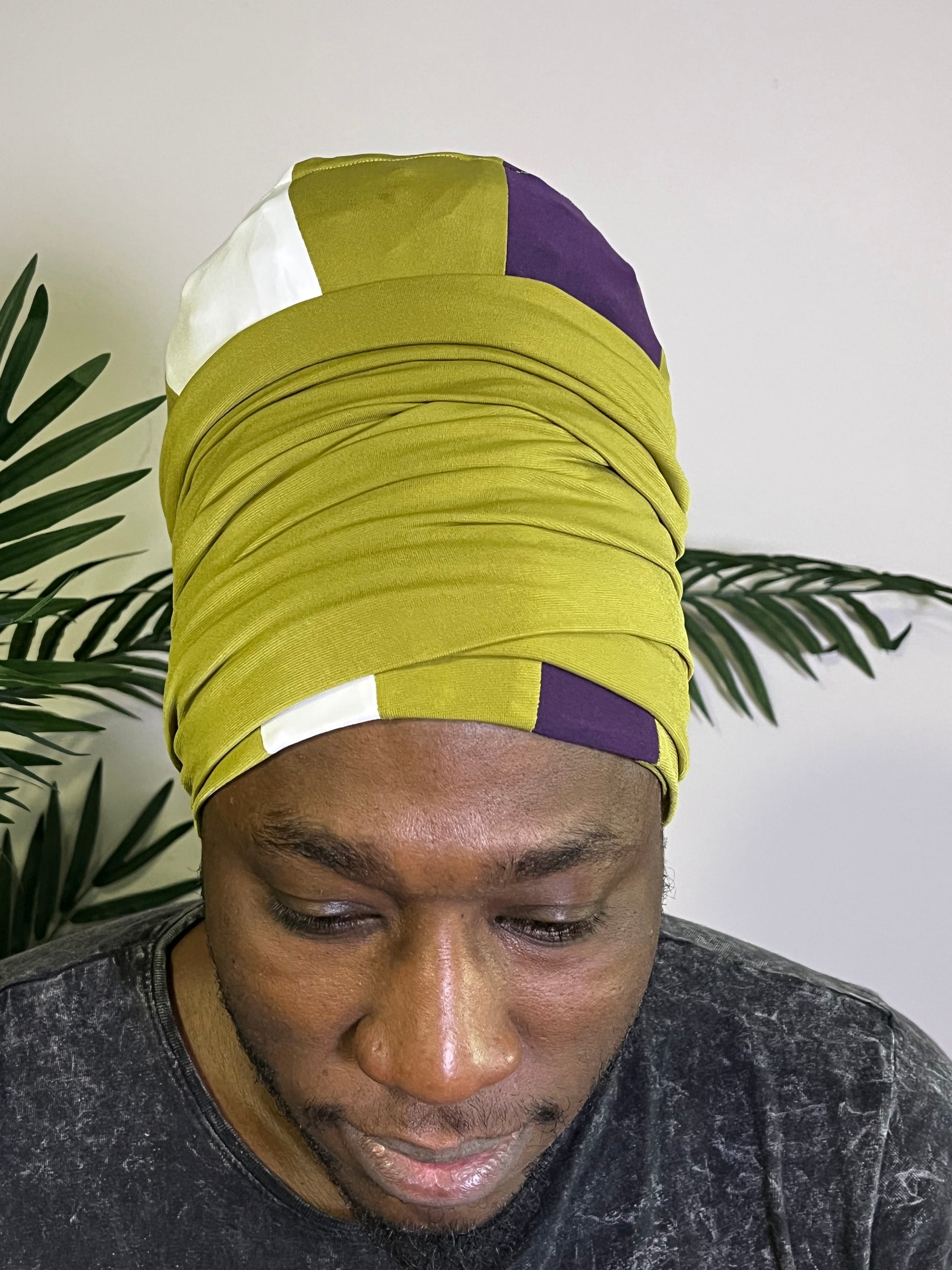 The tam wrap has a flat crown and one band at the back, front colors are light olive, plum, white. Rest of the tam is light olive.