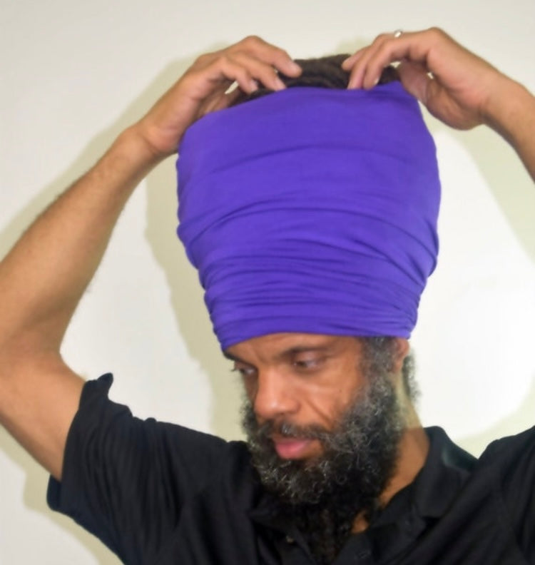 To wear tall as shown, first put your locs or hair up and slip the tube over your head, with the seam facing to the center back of your head, and adjust the height to suit.