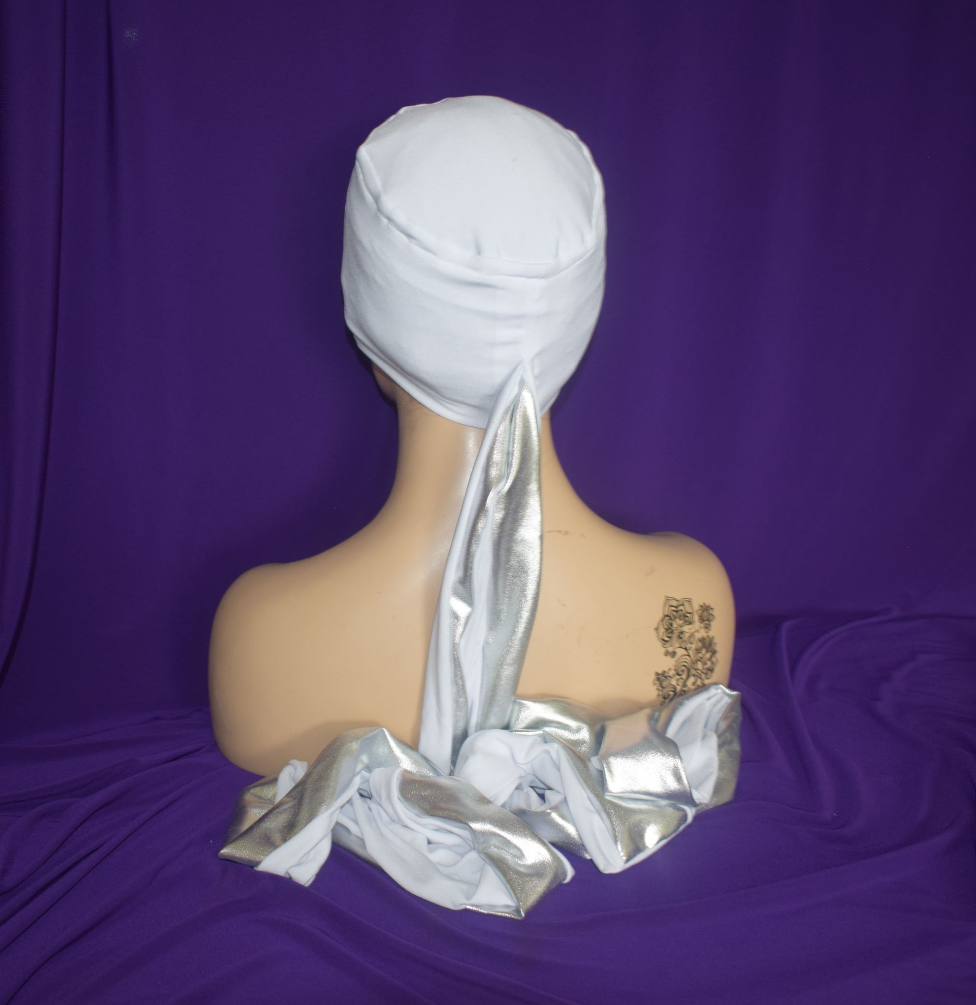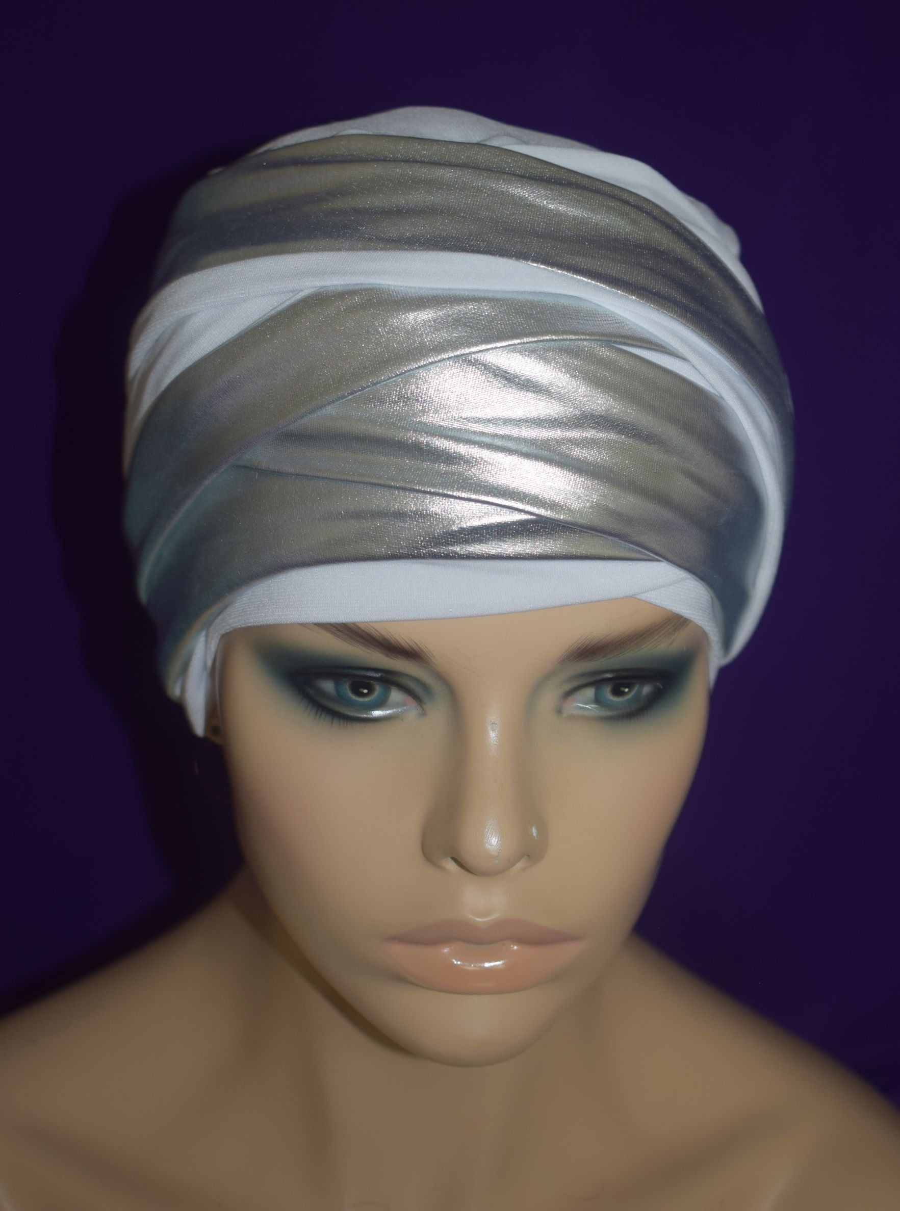 Turban is made from lightweight quality stretch fabric and lightweight metallic lame fabric.